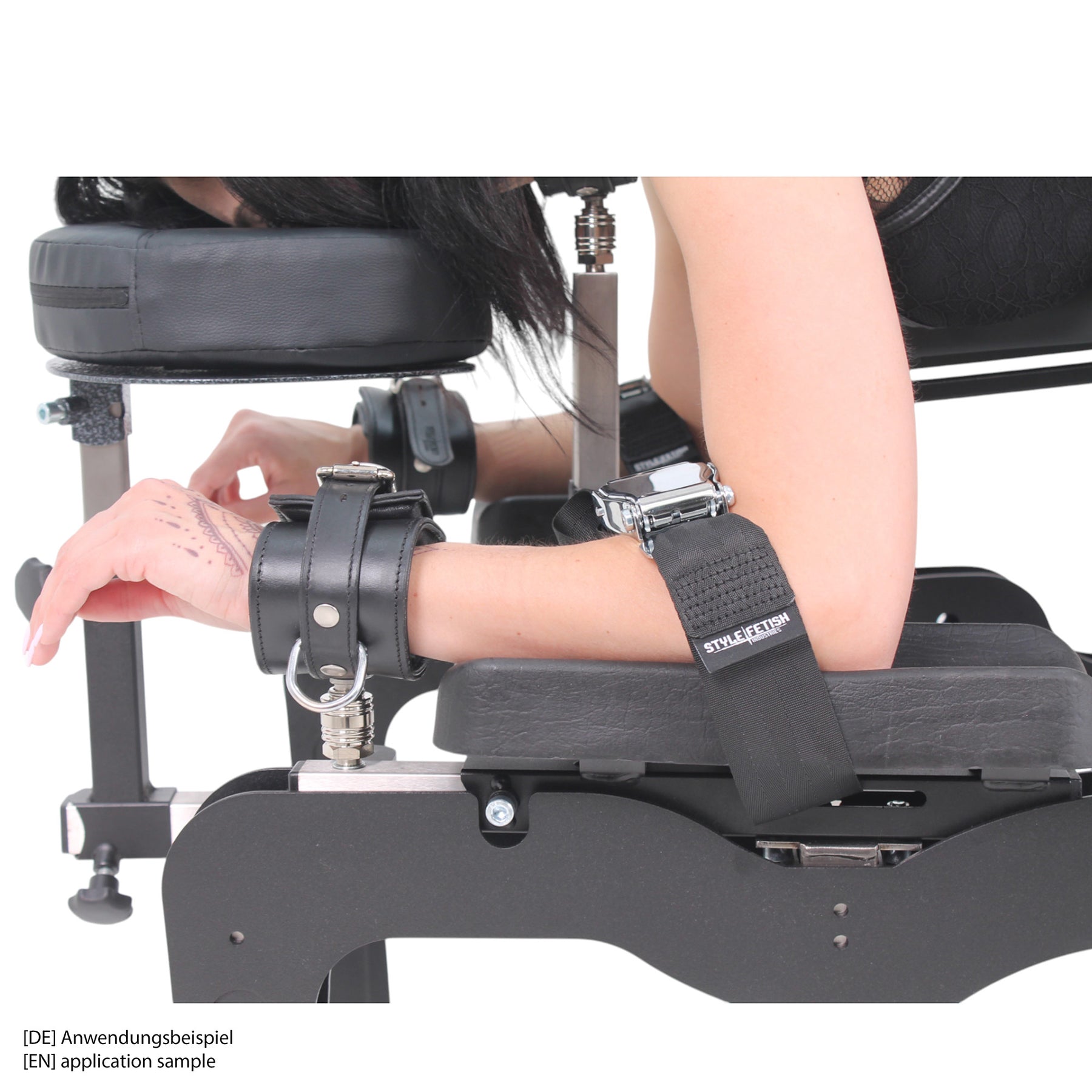 The Click & Play mechanism allows the hand restraints to be attached to compatible furniture with a single, intuitive motion—insert, press, and lock—making it easy to transition from free restraint to fixed positioning in seconds. Nearly all StyleFetish modular furniture systems can be equipped with the required coupling set, enabling seamless switching between steel restraints and Click & Play leather cuffs as needed.